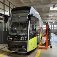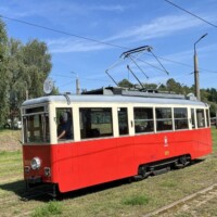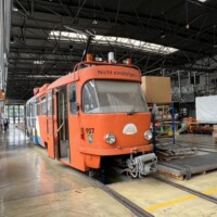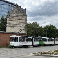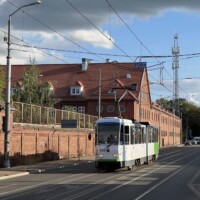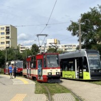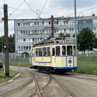 Am Freitag standen zwei Sonderfahrten auf dem Programm: zunächst holte uns Tw 258 (ZR-GT6 ex Kassel) im Stumpfgleis vor dem Bahnhof ab. Hier fährt sonst nur zu den Anschlusszeiten der Eisenbahn die Linie 4. Wir steuerten die Endstelle Fildorfa „Nila“ an, die vor der geplanten Erweiterung stumpf endet und deswegen Zweirichtungsfahrzeuge erfordert. Die meisten ex-Kasseler Zweirichter sind durch Ausbau des Heckfahrerplatzes und Stillsetzung der linken Türen zu Einrichtern umgebaut worden, wobei die linksseitigen Türen nur vorschlossen aber nicht ausgebaut wurden. Anschließend wurde im Depot auf Tw 137 (Typ 105 Na) und Tw 117 (Partybahn) gewechselt. Nach einer umfangreichen Besichtigung des Depots in Wieprzyce, einem Neubau mit Aufstellflächen als Rasengleis, ging es durch die Innenstadt zur Schleife Piaski, natürlich wieder mit mehreren Fotohalten, die dem Sonnenstand angemessen waren. Dort stand auch ein Original EinrichtungsÂsechsachser ex Kassel. Nach der Sonderfahrt gab es noch ausreichend Gelegenheit mit den klimatisierten, modernen, dreiteiligen Pesa-Twist-Fahrzeugen durch die Stadt zu fahren. Beim gemeinsamen Abschlussessen regnete es nach einem schönen Sommertag, gleichsam Tränen des Tagungsendes.