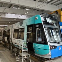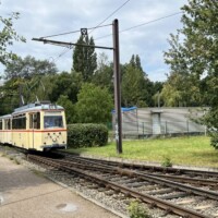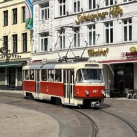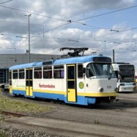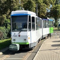 Am Samstagmittag holte uns in Schwerin Tw 803, gefahren vom amtierenden Geschäftsführer am Hauptbahnhof ab, um die einzelnen Streckenäste zum größten Teil abzufahren. Das Fahrzeug der Serie SN2001 ist als erstes seiner Reihe durch ein Refit-Programm gelaufen und hat neue Sitze, Beleuchtung und eine (funktionierende!) Klimaanlage erhalten. Wir befuhren auch die sonst selten genutzten Schleifen Bertha-Klingberg-Platz und Berliner Platz. Im Depot sahen wir die Kinderstraßenbahn (Tatra T3D 111), den ausgemusterten Dienstwagen 907 und die beiden historischen Triebwagen 26 und 417, die wegen Personalmangel die von uns gebuchte Sonderfahrt nicht durchführen konnten. Am Abend erfolgt die Weiterreise nach Rostock.