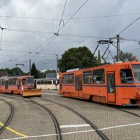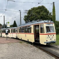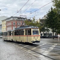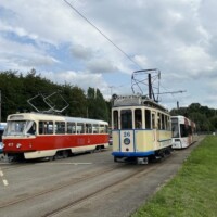 Am Sonntagmorgen holte uns der historische Gotha G4-Gelenkwagen 1 in der Langen Straße, am Neuen Markt und am Steintor in Rostock ab. Die Fahrt führte über Dierkower Kreuz zur Hafenallee und zurück über den Doberaner Platz zum Depot Hamburger Straße, wo die Arbeitswagen 551 und 552 vom Typ T6A2M für uns aufgestellt wurden und wir eine Hallenführung erhielten. Nach einem Platzregen ging es weiter mit dem Lowa-Zug 46+156, der uns Richtung Neuer Friedhof und dann nach Lichtenhagen brachte. Im „depot12“ gab es zum Abschluss eine Parade mit vier historischen Wagen, danach gab es Kaffee und Kuchen. Die Crew der Rostocker Nahverkehrsfreunde arbeitet sehr gut zusammen.