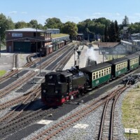 Vom Wasserturm im Bw Putbus lässt sich die Ausfahrt der gleichen Lok Richtung Göhren verfolgen