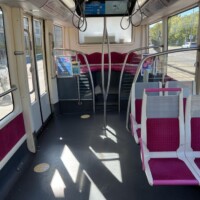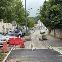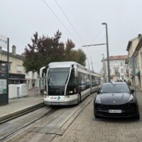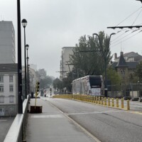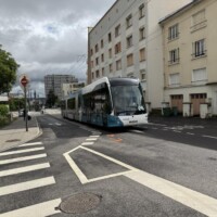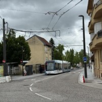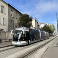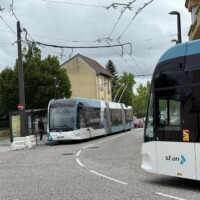 pub-fr-nancy-neuer-obus-2023Die neuen Hess-lighTram® 25-Wagen machen einen guten Eindruck, insgesamt erscheint aber die gewählte Fahrgeschwindigkeit des Betreiber STAN genauso gemütlich wie zuvor beim TVR (vielleicht will man die Wagen und die Oberleitungsanlage noch schonen). Große Teile der Strecke sind leider ganz ohne Oberleitung (vor allem fast alle Kurven). Am Bahnhof musste der ehemalige eigene Gleiskörper stark umgebaut werden, weil die TVR-Fahrzeuge halt sehr enge Kurven meistern konnten, was bei einem “Bus” schlecht geht. Die dortige Haltestelle hat man kurzerhand einfach ganz weggelassen (wobei die nächste auch immer noch in Sichtweite des Bahnhofs liegt)